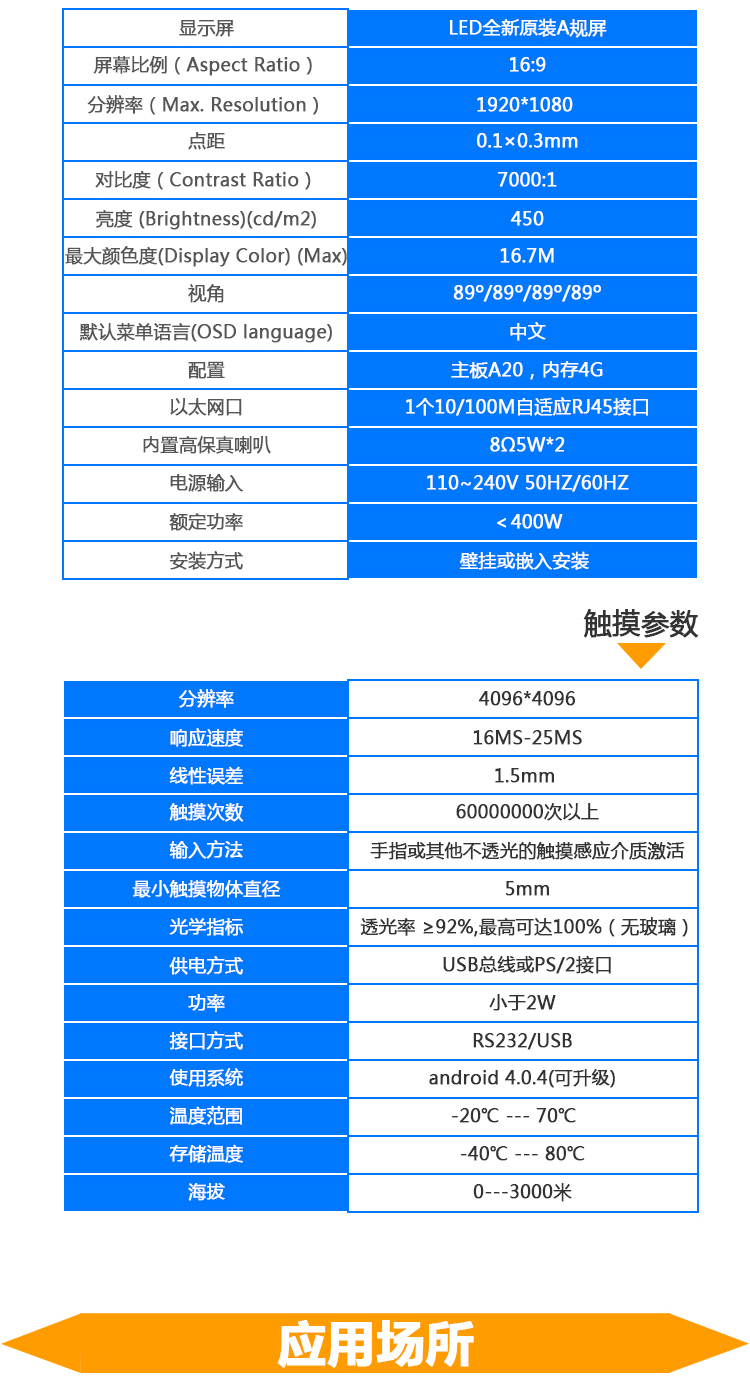 | - 觸摸方式:通過(guò)后臺(tái)發(fā)布模板鏈接網(wǎng)頁(yè)到終端設(shè)備,當(dāng)沒(méi)人觸碰顯示屏?xí)r正常播放廣告,當(dāng)有人觸摸時(shí)自動(dòng)進(jìn)入觸控鏈接模板