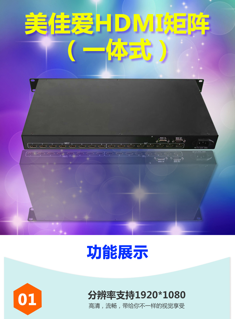 -HDMI高清全數字矩陣切換器, 所有端口支持藍光DVD(支持HDCP);輸入輸出自動均衡,輸入加輸出傳輸距離大于40米(不需配帶芯片的HDMI線);鋁拉絲面板,帶藍光液晶顯示屏顯示操作狀態;帶串口控制,可選配網口;所有輸入端口支持現場寫EDID,所有輸出端口可讀回EDID。