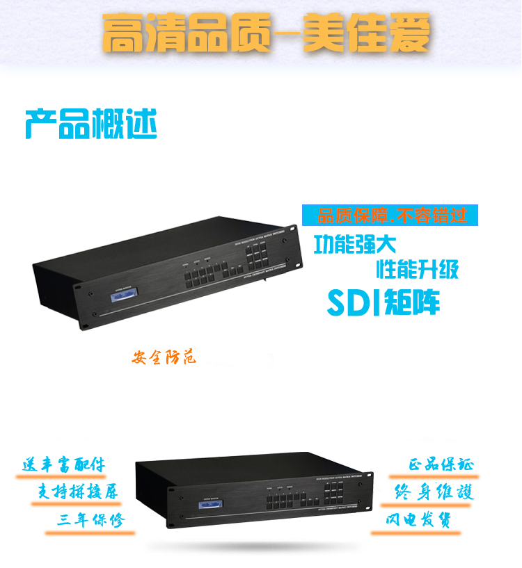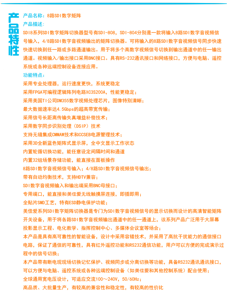【深圳市美佳愛-矩陣切換器,視頻拼接處理器生產(chǎn)廠家電話400-997-9971】SDI矩陣切換器產(chǎn)品通過ISO9001_3C認(rèn)證,型號規(guī)格有4進(jìn),8進(jìn),12進(jìn),16進(jìn),24進(jìn),32進(jìn),48進(jìn),64進(jìn),128路輸入,4出,8出,12出,16出,24出,32出,48出,64出,128路輸出,專業(yè)提供LED視頻處理器,監(jiān)控音視頻矩陣切換器,DVI/SDI/RGB/HDMI/VGA混合矩陣,外置拼接處理器,視頻服務(wù)器,云處理器,液晶大屏幕處理器,視頻分配器,網(wǎng)絡(luò)高清數(shù)字解碼矩陣主機(jī)生產(chǎn)廠家,高品質(zhì),穩(wěn)定性強的產(chǎn)品