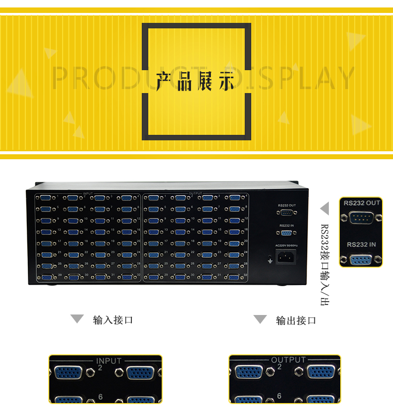 - 提供 RS232 通訊接口,控制協議簡要易用。可高速處理 RS232 通訊數據,這樣提高了 DLP 等顯示設備信號切換的等待時間。