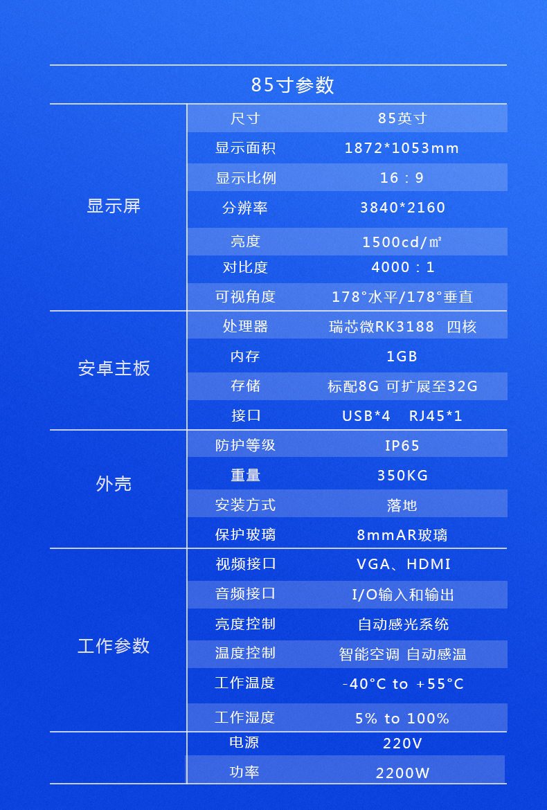 2.1 采用戶外專用高亮度液晶屏,亮度1500-2500nit,強光下可視,設計壽命50000小時 。
