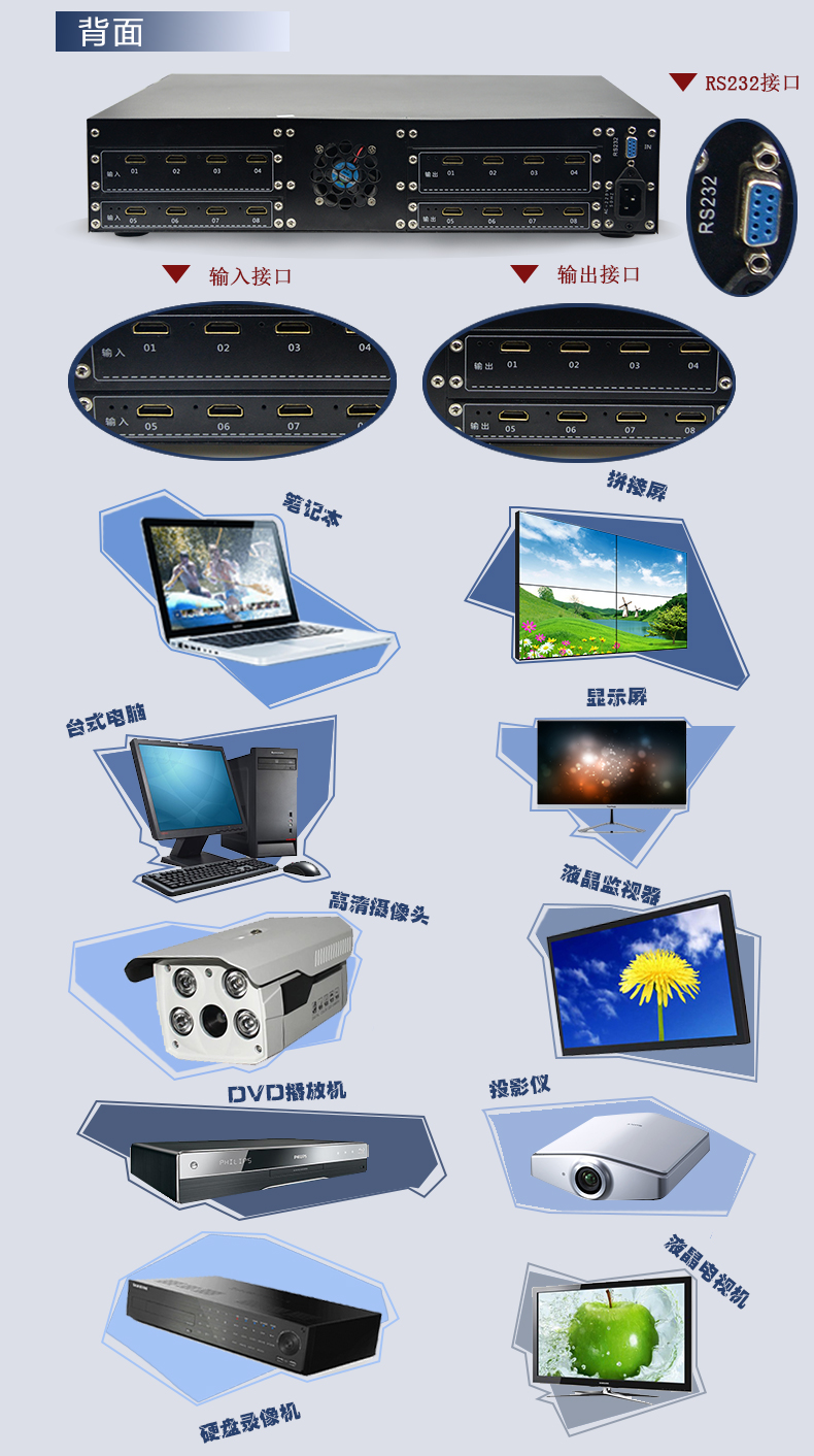 5.可拼接(選配),兼容了拼接處理器功能,支持普通電視、液晶顯示器及DLP等實現大屏幕拼接功能;